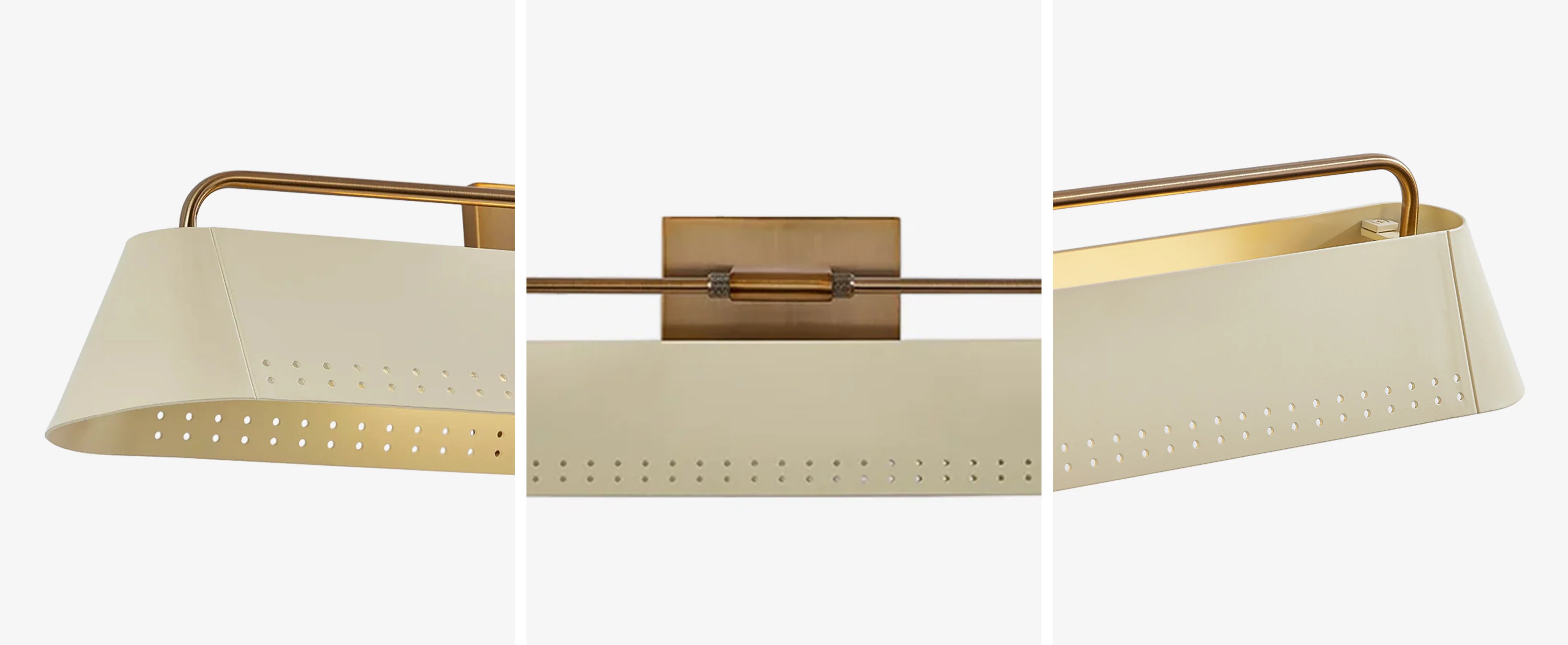 Mit seinem schlanken, rennbahnförmigen Schirm und dezenten perforierten Details verbindet diese Leuchte modernen Minimalismus mit zeitloser Eleganz. Der sanft geschwungene Stahlkörper, ausgeführt in warmem Patina-Messing mit einem sanften Sandfarbton, schafft eine elegante, aber zurückhaltende Präsenz, die eine Vielzahl von Einrichtungsstilen ergänzt.