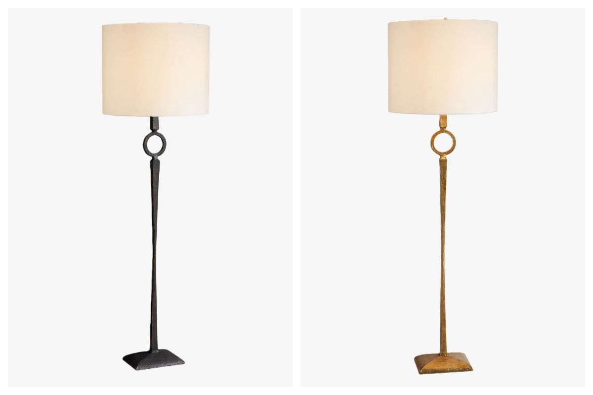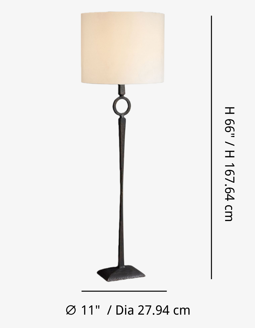Diese Stehlampe verkörpert eine minimalistische Designphilosophie und fügt sich mühelos in verschiedene Einrichtungsstile ein, von modern bis transitional. Die robuste Struktur aus Schmiedeeisen bietet stabilen Halt, während der einpolige Sockel einen Hauch von Eleganz verleiht.