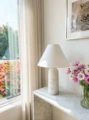 Lámpara de mesa de cerámica texturizada orgánica Mello con pantalla de tambor de tela - Iluminación moderna para sala de estar y oficina