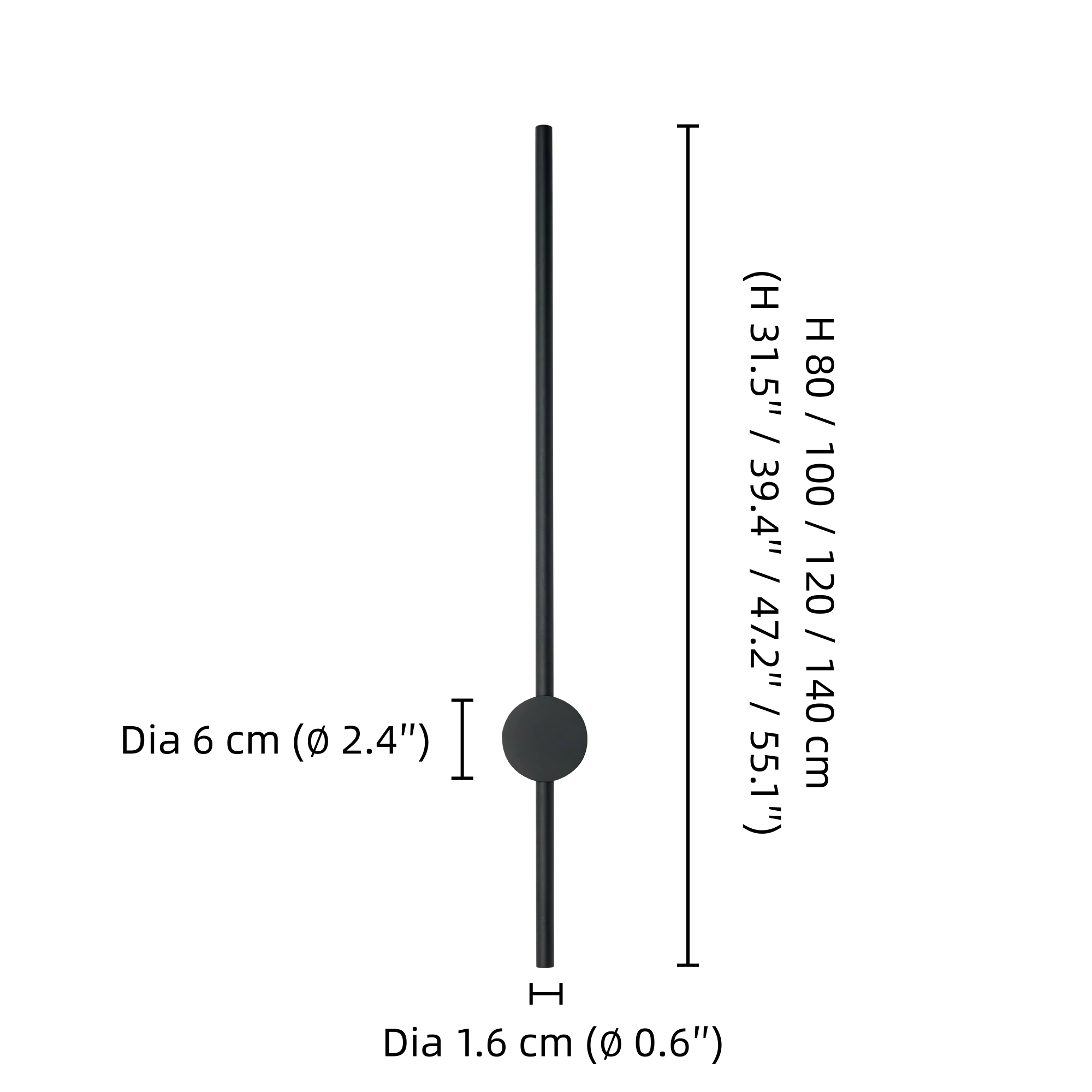- Diámetro 1.6 cm × Altura 80 cm / ∅ 0.6″ × Altura 31.5″