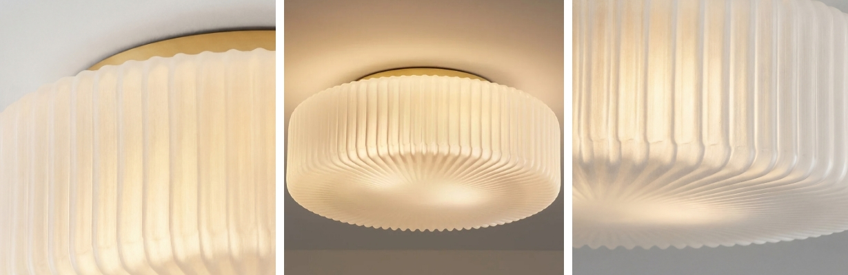 Lunorib es una lámpara de techo moderna de vidrio opalino acanalado que aporta elegancia sobria y una iluminación cálida y difusa a cualquier espacio. Su pantalla texturizada acanalada dispersa suavemente la luz, creando un ambiente acogedor en pasillos, salas de estar, dormitorios y otros espacios interiores.