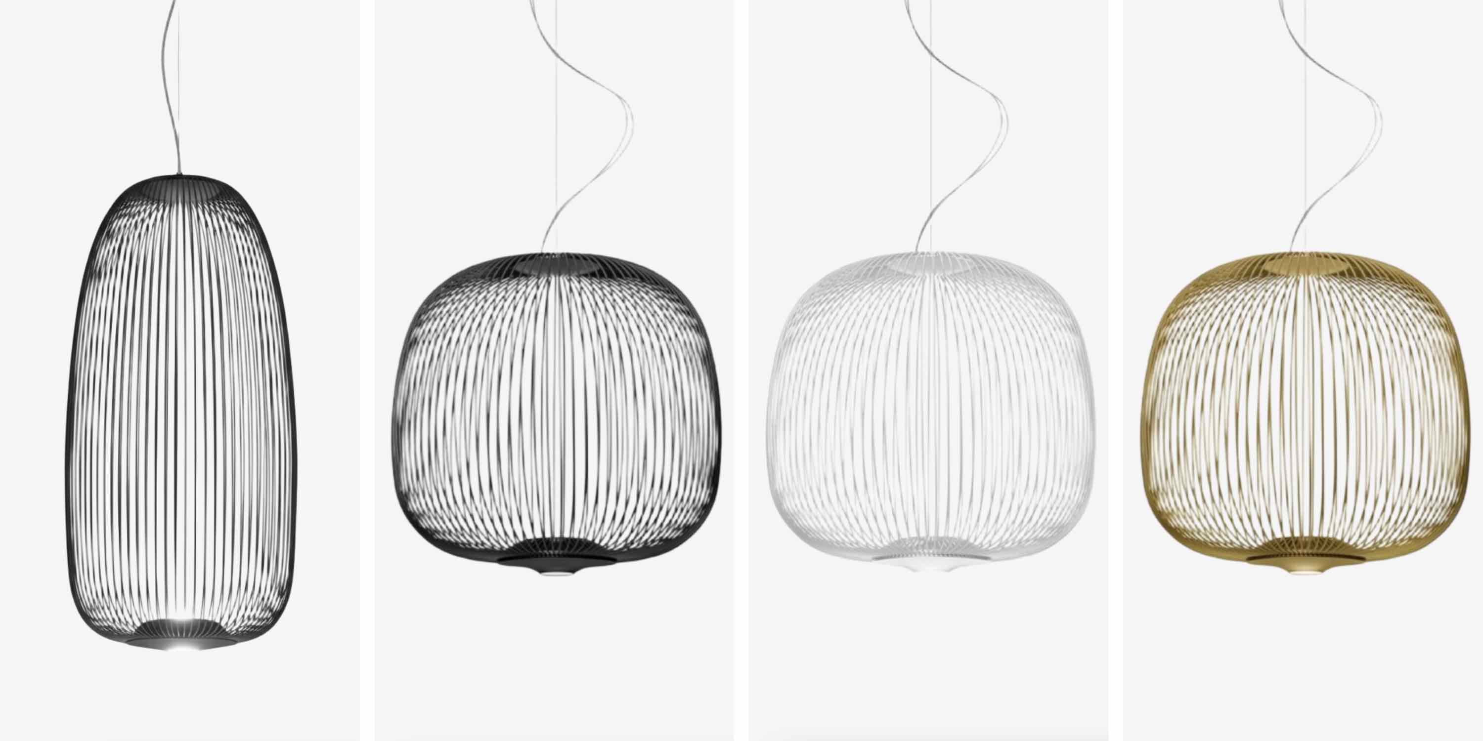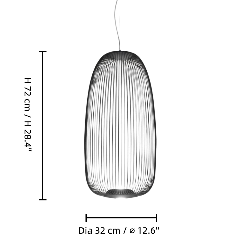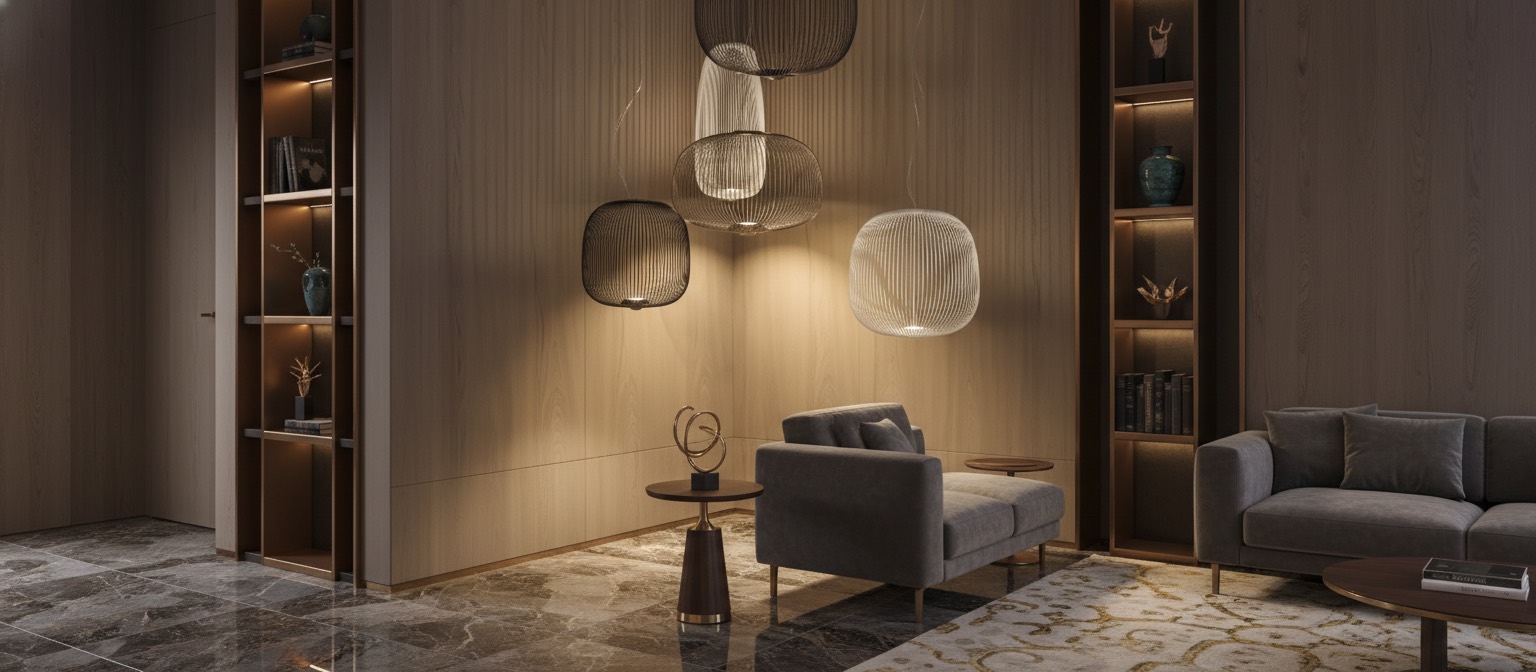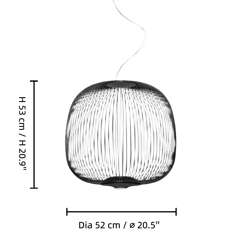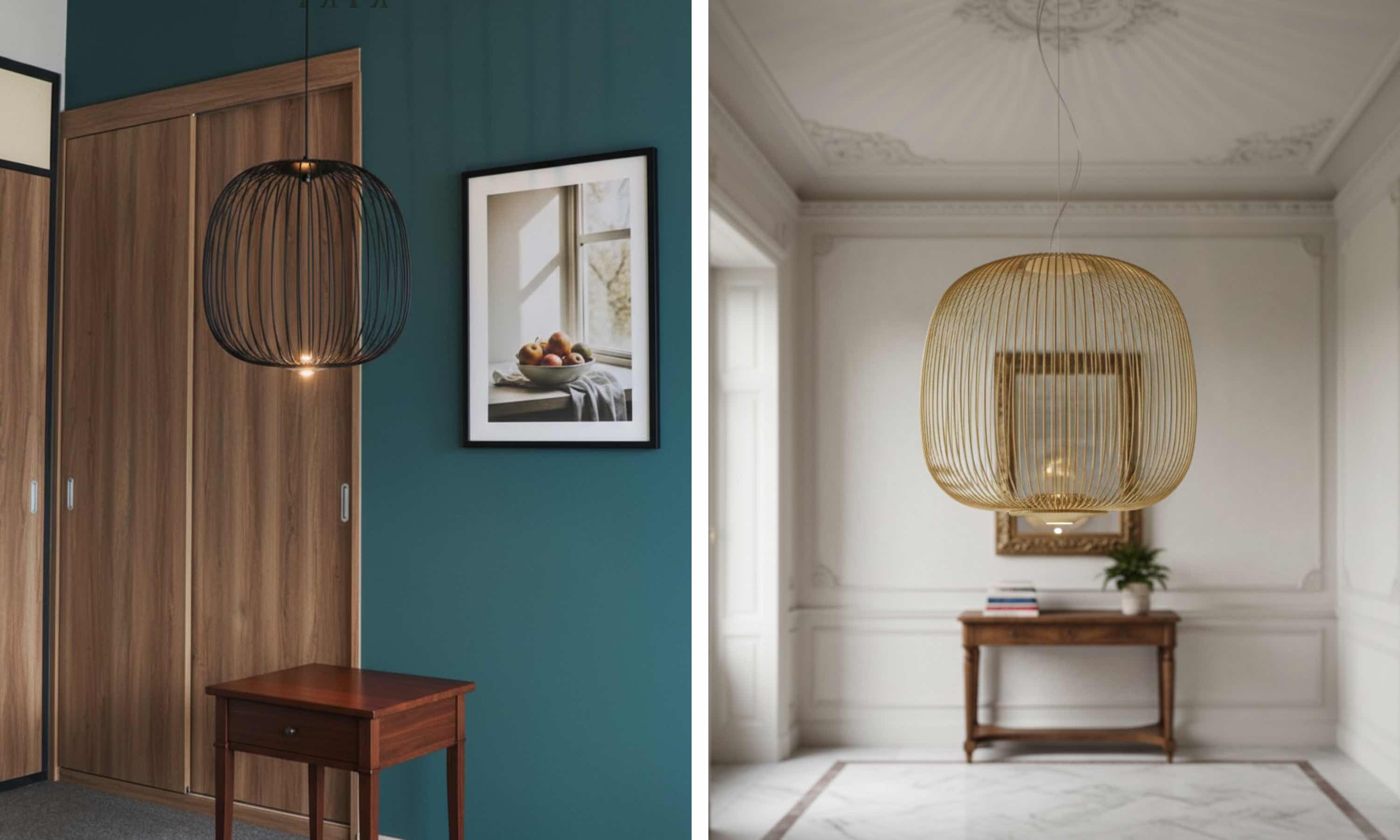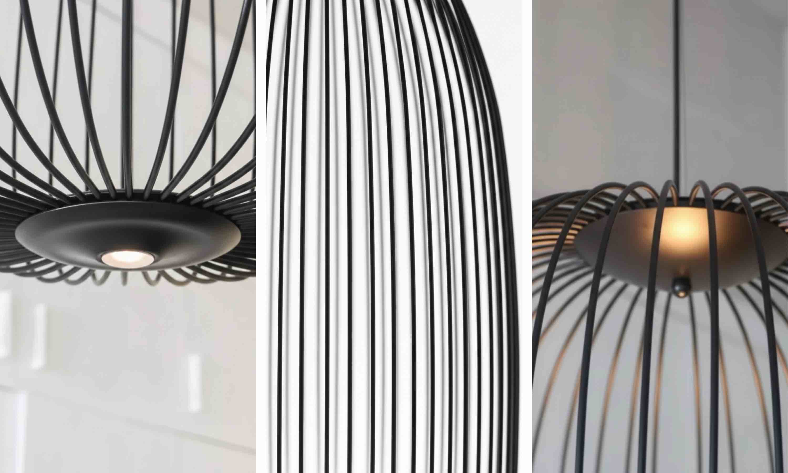 - Elegancia geométrica: Una impresionante jaula de líneas metálicas crea patrones artísticos de luz.
