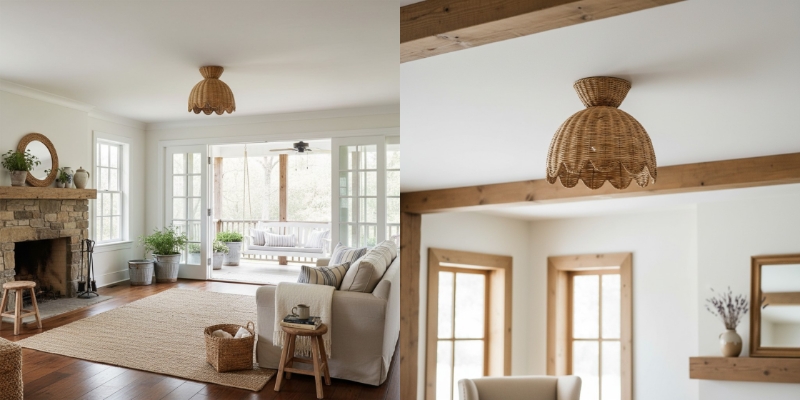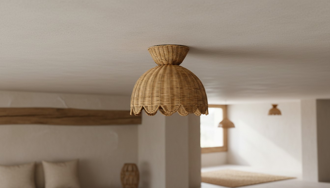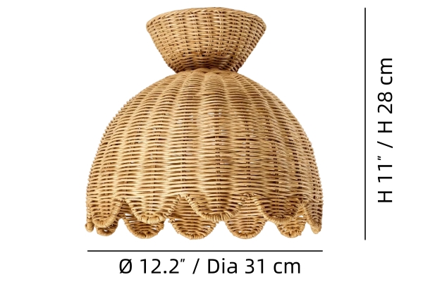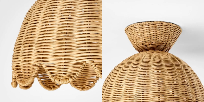 Esta lámpara de techo empotrada estilo Rattalia presenta una silueta escultórica en forma de flor con una pantalla tejida y con bordes ondulados que suaviza y difunde la luz. Diseñada para crear un resplandor cálido y relajado, funciona maravillosamente en entradas, cocinas, rincones de lectura o espacios acogedores para vivir.