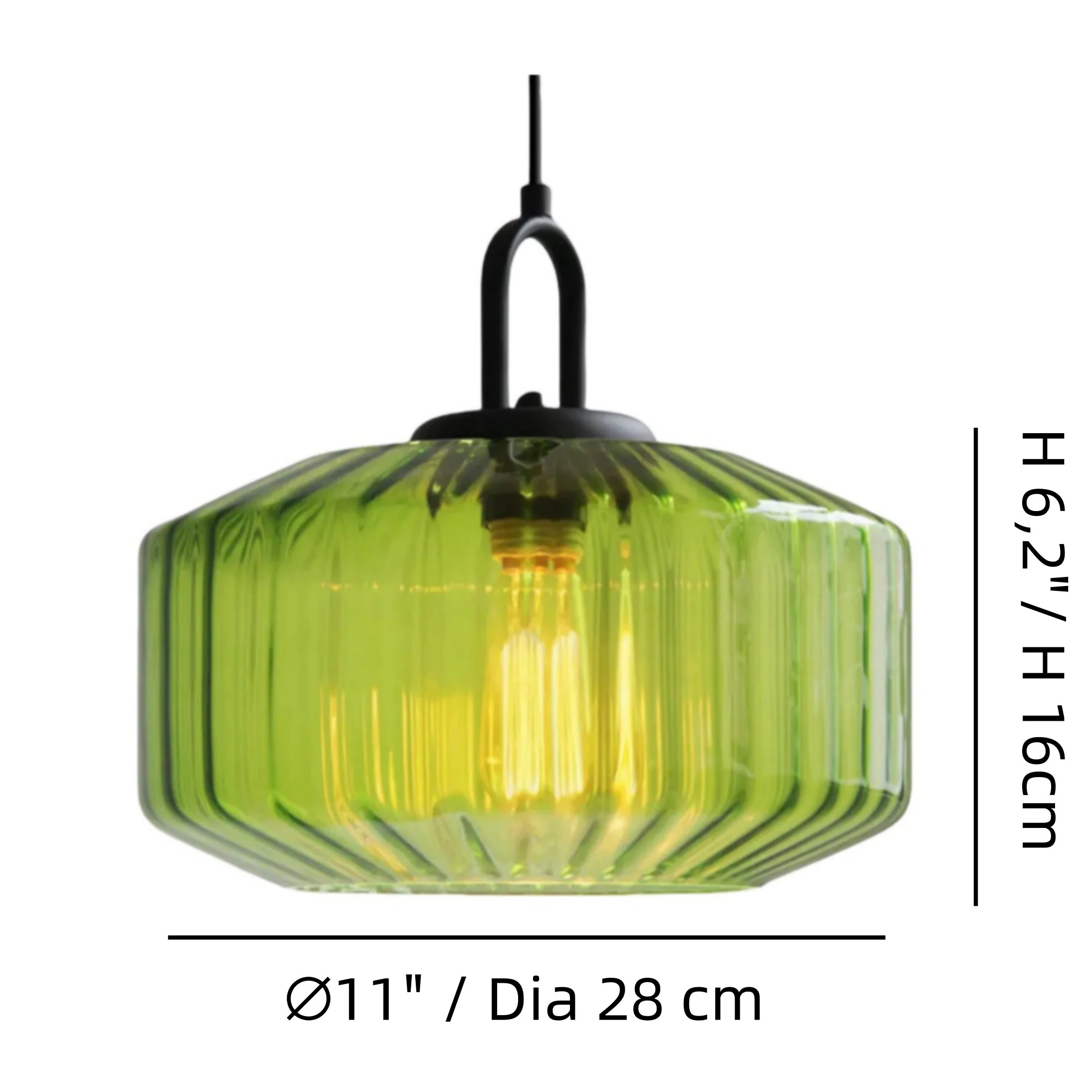 Una lámpara colgante vintage de vidrio verde con un elegante diseño de vidrio acanalado. Esta moderna lámpara colgante de vidrio se adapta a diversos interiores, ofreciendo una luz suave y un ambiente elegante.