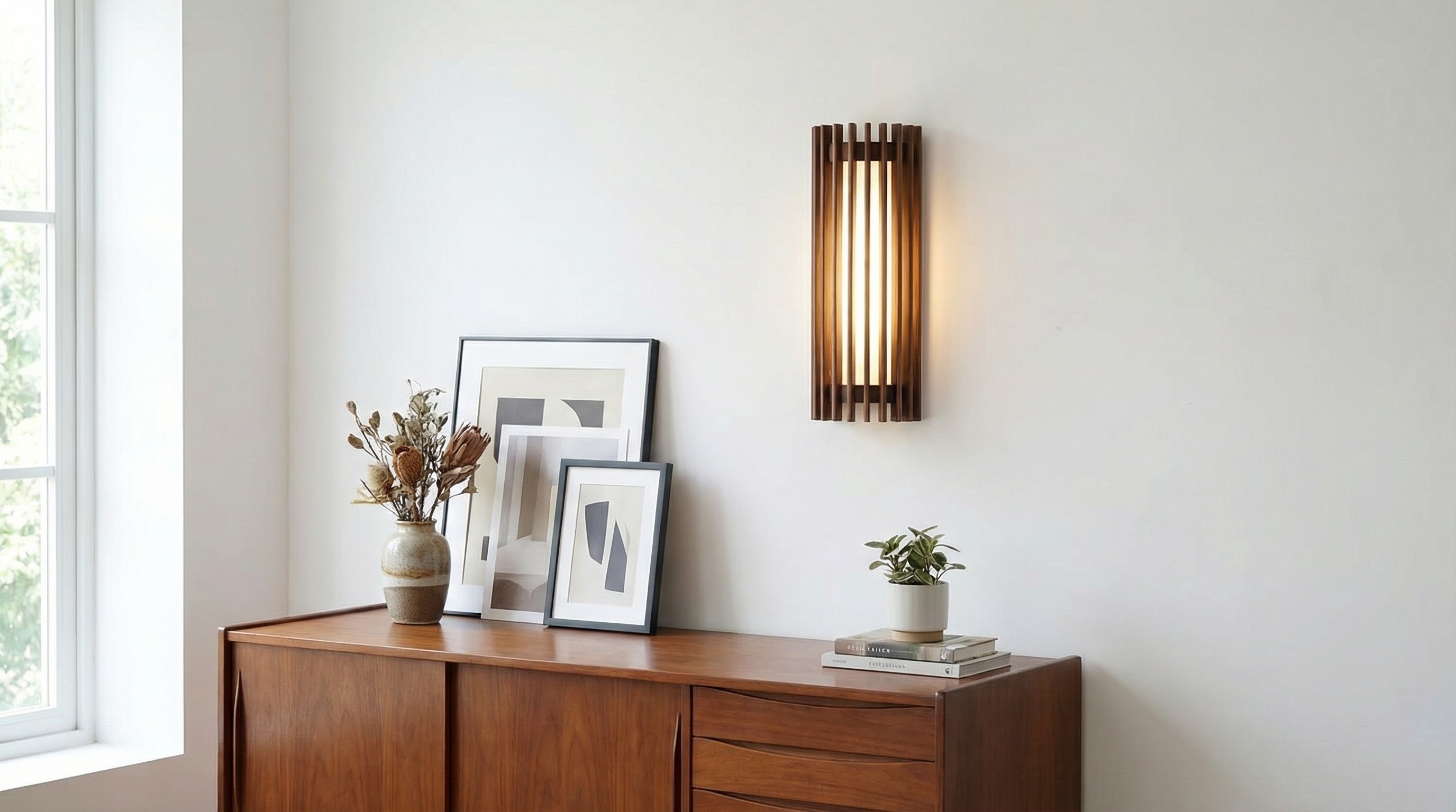 Présentation de la lampe murale Boskelux en noyer, un mélange raffiné de forme sculpturale et de chaleur naturelle. Cette lampe murale présente une plaque arrière élégamment courbée et un support compact, qui soutient un abat-jour diffusant doucement la lumière, créant un halo lumineux délicat.