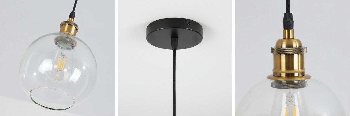 - Globe en verre : Un abat-jour sphérique en verre transparent diffuse la lumière uniformément pour une lueur douce.