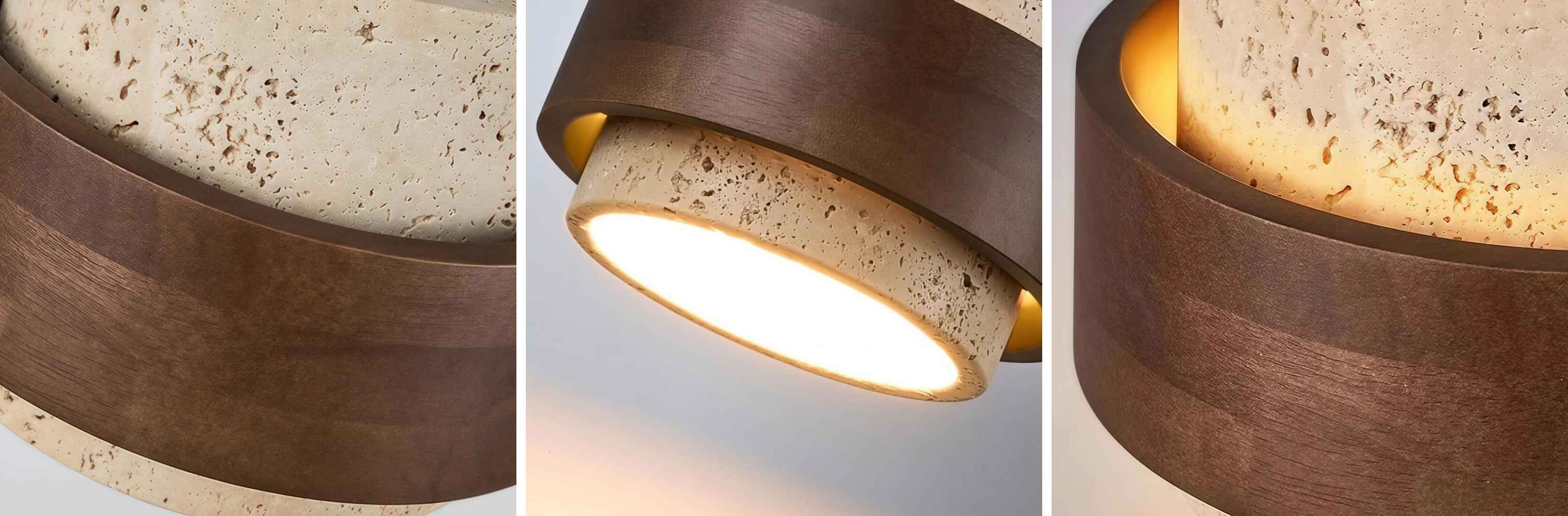 - Matériau organique : Le travertin et le bois ajoutent texture et chaleur.