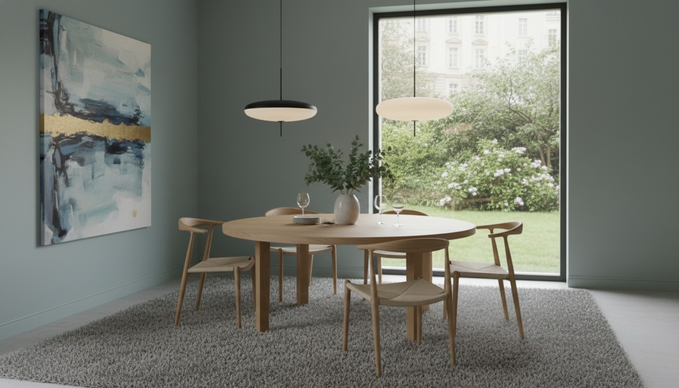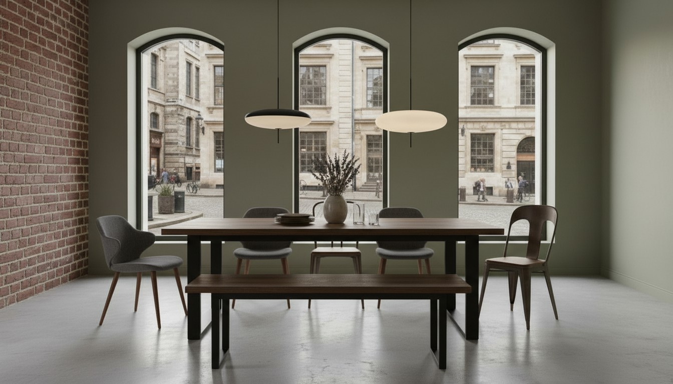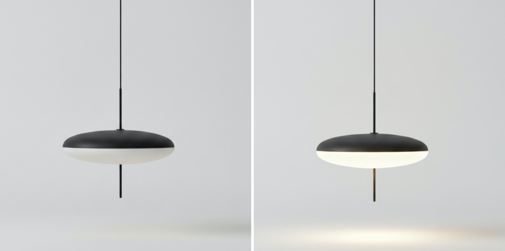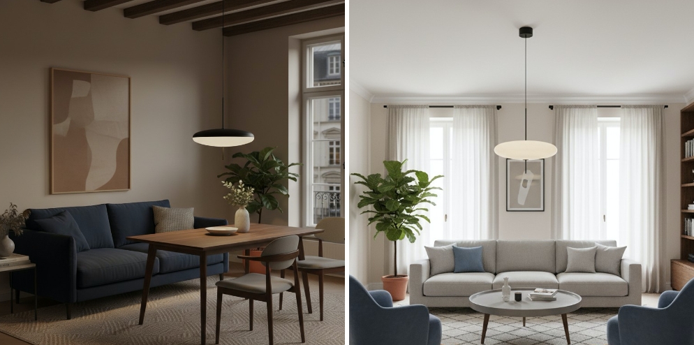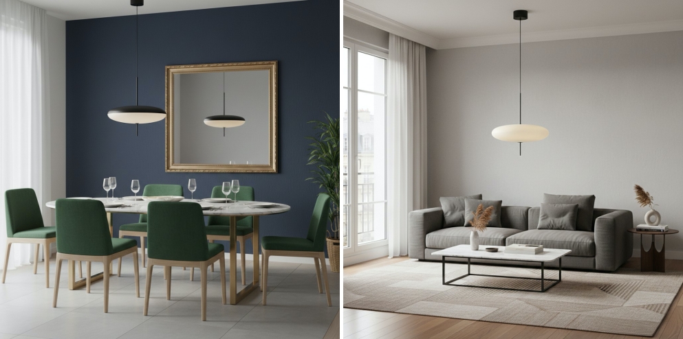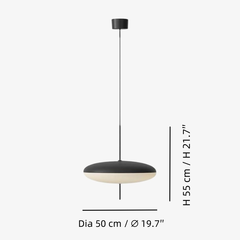 This pendant light features a wide dome silhouette and clean, architectural lines that create a strong yet balanced visual impact. Inspired by industrial design, its refined proportions make it well suited for dining areas, kitchen islands, living spaces, or open-plan interiors.