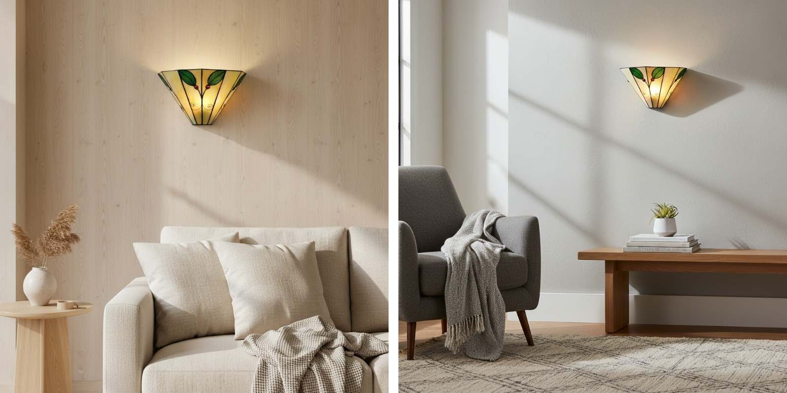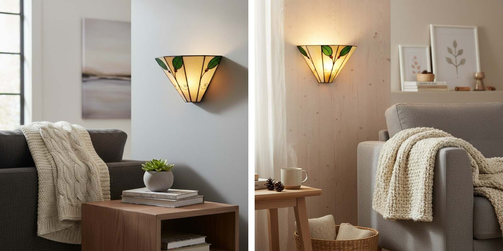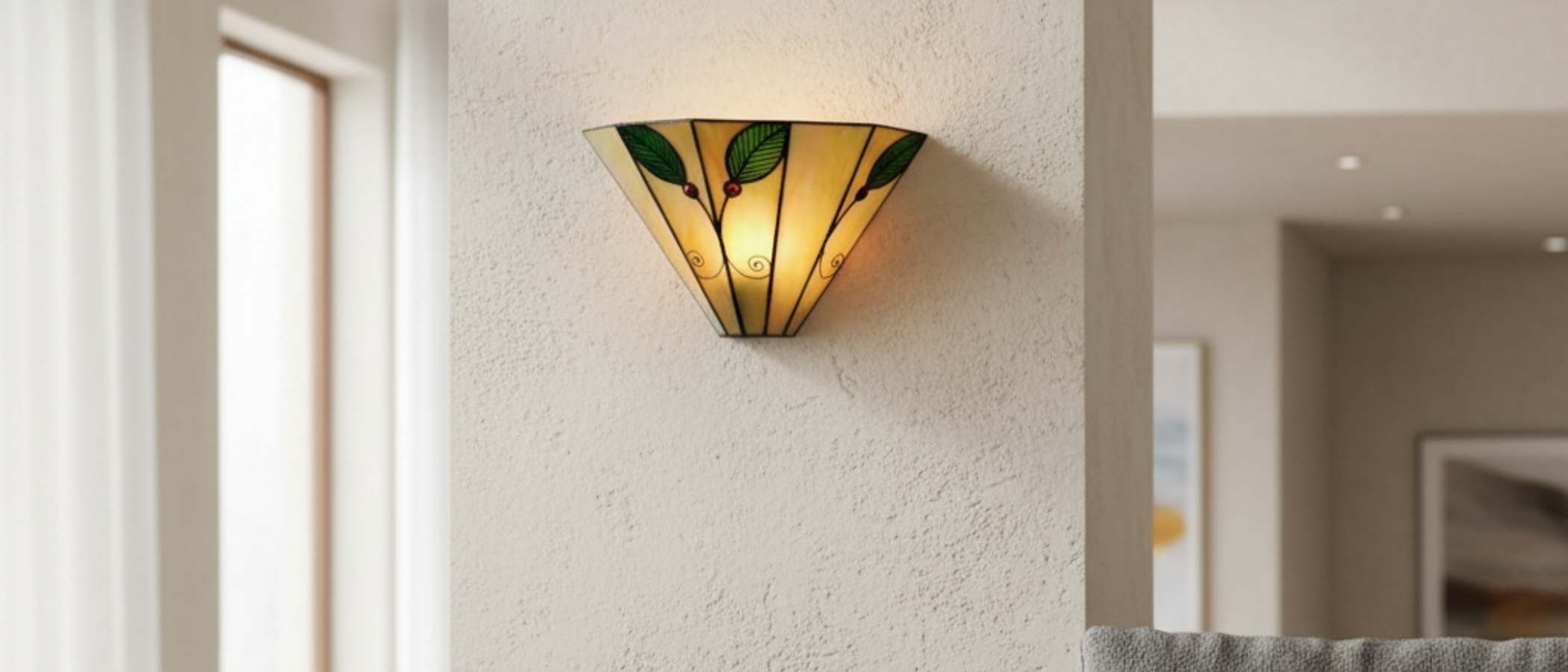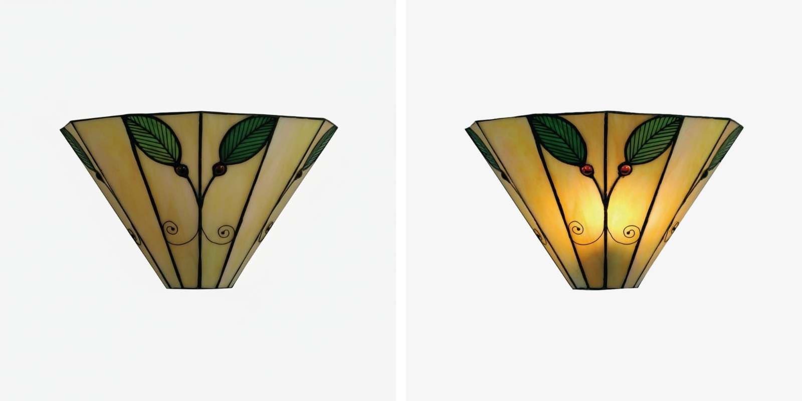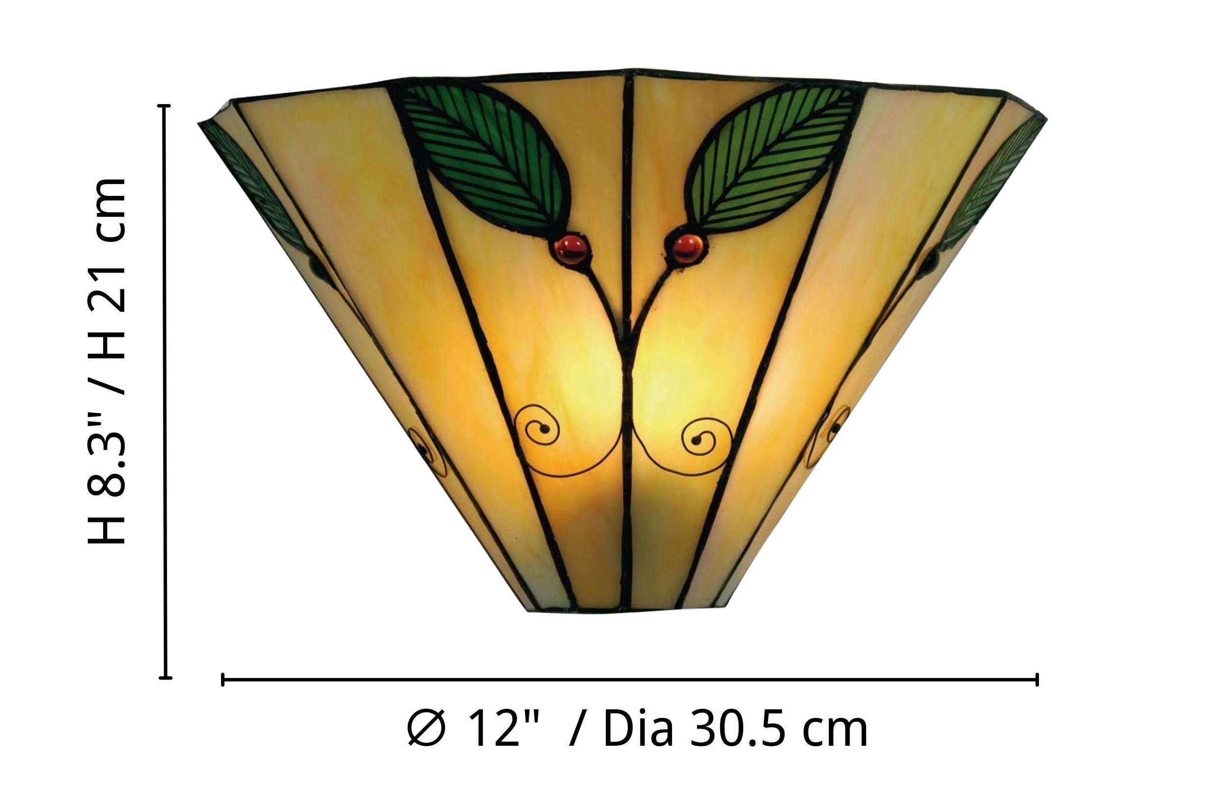Illuminate your home with the timeless elegance of our Tiffany-style wall light. Featuring a graceful leaf motif, this lamp is handcrafted from exquisite stained art glass, casting a warm and inviting glow.