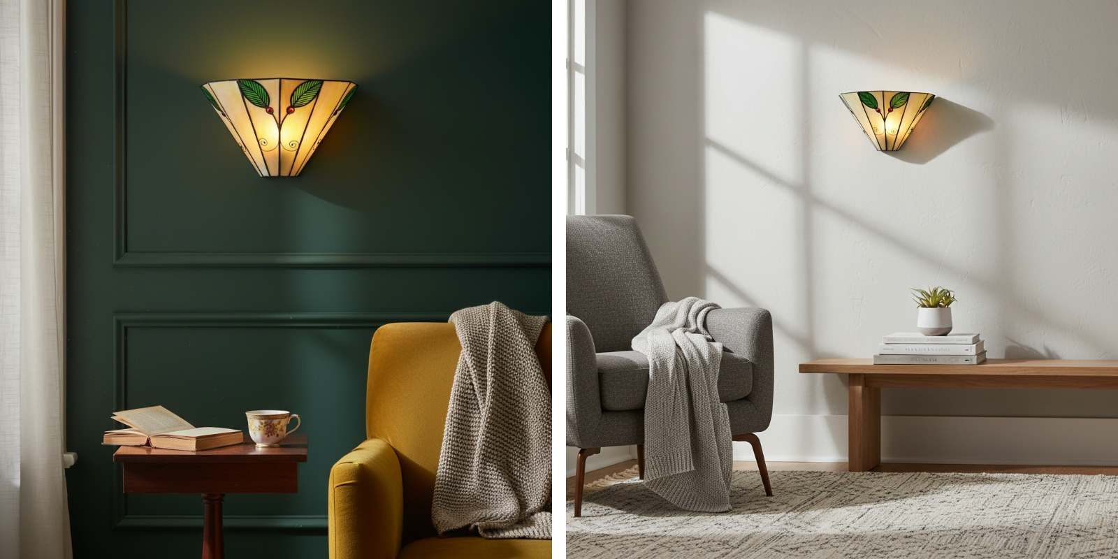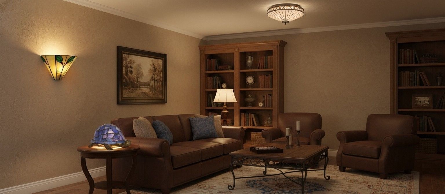 - Ambient Glow: Stained glass shade diffuses light to create a warm, inviting atmosphere.